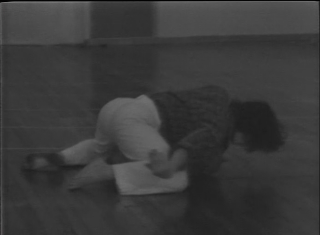 Of the same generation as Jonas is Simone Forti, who is of foundational importance in thinking about animality through performance work. The American Italian dancer and choreographer’s seminal contributions to both Postmodern dance and the Fluxus movement have been an influence to many. In the ’70s she developed movement vocabulary based on observations of locomotion and dance behavior by animals in captivity within various zoos. For example, she took cues from the repetitive pacing of big cats, polar bears, and elephants to adapt patterns of movement such as pacing and swinging her head back and forth. In 1975, Forti screened two videotapes in The Kitchen’s Video Viewing Room that demonstrated such studies. Identified on The Kitchen’s program as Grizzleys and later known as Three Grizzlies (1974), the video was shot at the Central Park Zoo and traced the actions of grizzly bears inside of their enclosures as a kind of dance movement. In Solo #1 (1974), Forti performs a movement study guided by the human body interacting with natural forces of gravity and momentum. The piece begins on two legs and evolves through repetitive motions such as crouching poses, soft rolling falls, and crab-like crawling to sliding along the floor on her stomach. This work seems to also be a predecessor to another entitled Door Studies (1982), which Forti presented in an evening program at The Kitchen that included solo sections and group forms, and included live music as well as sculpture.