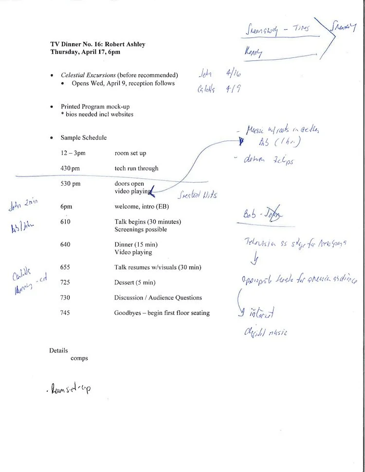 Images: 1) Still from recording of Joan Logue, TV Dinner No. 1: Joan Logue: Video Portraits, October 2–3, 1998 at The Kitchen. Video recording from the collection of The Kitchen Archive, ca. 1971–1999. The Getty Research Institute. 2) Menu printed in program for Joan Logue, TV Dinner No. 1: Joan Logue: Video Portraits, October 2–3, 1998 at The Kitchen. 3) Left: Annotated internal document outlining run of show for TV Dinner No. 16: Robert Ashley, April 17, 2003 at The Kitchen. Right: Internal document outlining run of show for TV Dinner No. 6: Paul Kaiser and Shelley Eshkar, December 9–11, 1999 at The Kitchen. 4) Postcard for Shirin Neshat, Sussan Deyhim, Ghasem Ebrahimian, and Shoja Azari, Logic of the Birds, October 5–16, 2001 at The Kitchen. Front. To see the full postcard, click here.