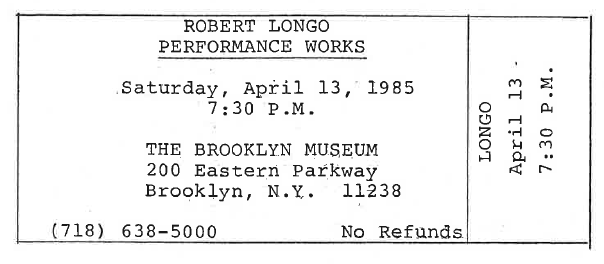 In the following years, Longo had several opportunities to return to The Kitchen to present new works. In 1985, The Kitchen presented Performance Works: 1977–1985 in collaboration with The Brooklyn Museum, coinciding with the presentation at the museum of his installation Temple of Love (1985). For this performance event, Longo performed Sound Distance of a Good Man (1978) and Surrender (1979), a film and performance piece, as well as a newer work, Empire: A Performance Trilogy (1981). Performance Works is particularly significant in displaying Longo’s evolution as an artist, as well as his work and relationship with The Kitchen. This event juxtaposed past performances created during his tenure at The Kitchen with a new piece and an installation that encompasses the wide variety of mediums and experimental methods that Longo uses in his works.